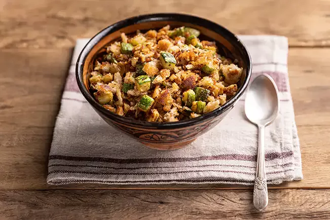 Crocante até dizer chega e muito saborosa, essa farofa é preparada com pão amanhecido batido e cubinhos de abobrinha gre…