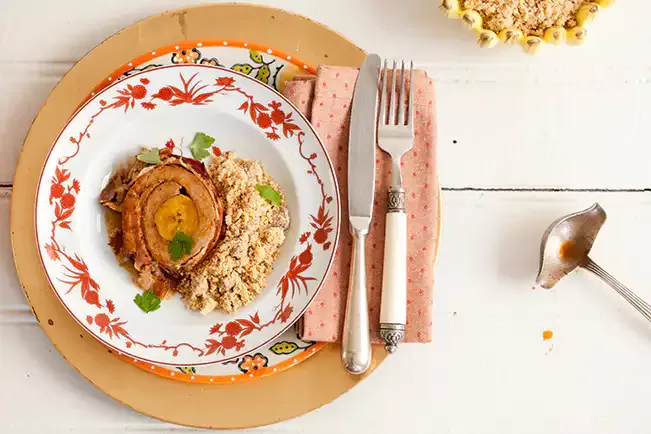 Para deixar esta preparação bem tropical, a carne é marinada com suco de abacaxi e pimentão e ganha recheio de banana an…