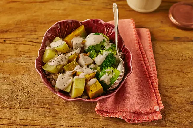 Salada de arroz sete cereais com legumes assados e molho de tahine
