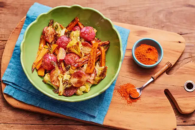 Couve-flor, cenoura e rabanete ficam dourados, com um tostadinho caramelado que confere ao prato um sabor único, com um …