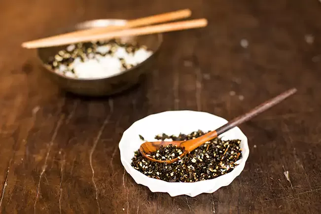 Originalmente, o temperinho oriental leva algas, peixe e gergelim. Versão brasileira – e prática: chips de couve no luga…